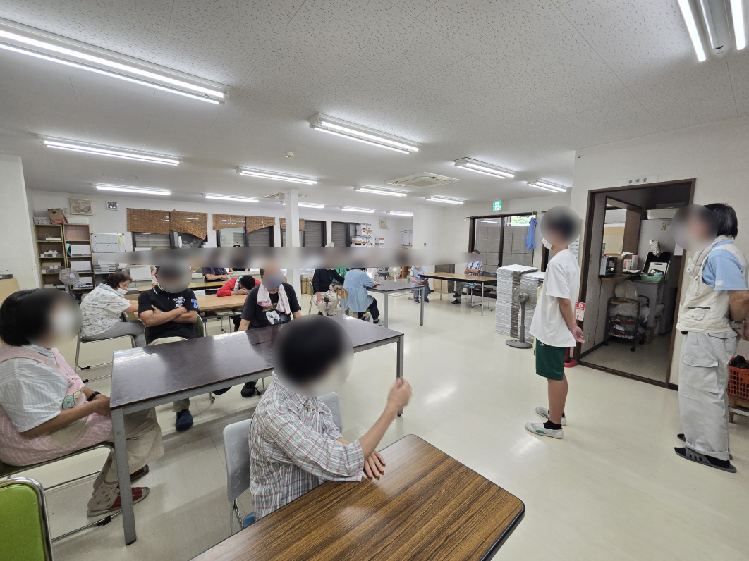 座学の場面では、避難訓練を振り返り、「避難場所まで遠い」「トイレが心配、マップがあるといい」「避難途中に道が崩れて通れんようになったらどうするんかなー」「道が悪かったら、車いすの人が避難するのが難しい」など、利用者さんからの真剣で活発な意見が出ていました。